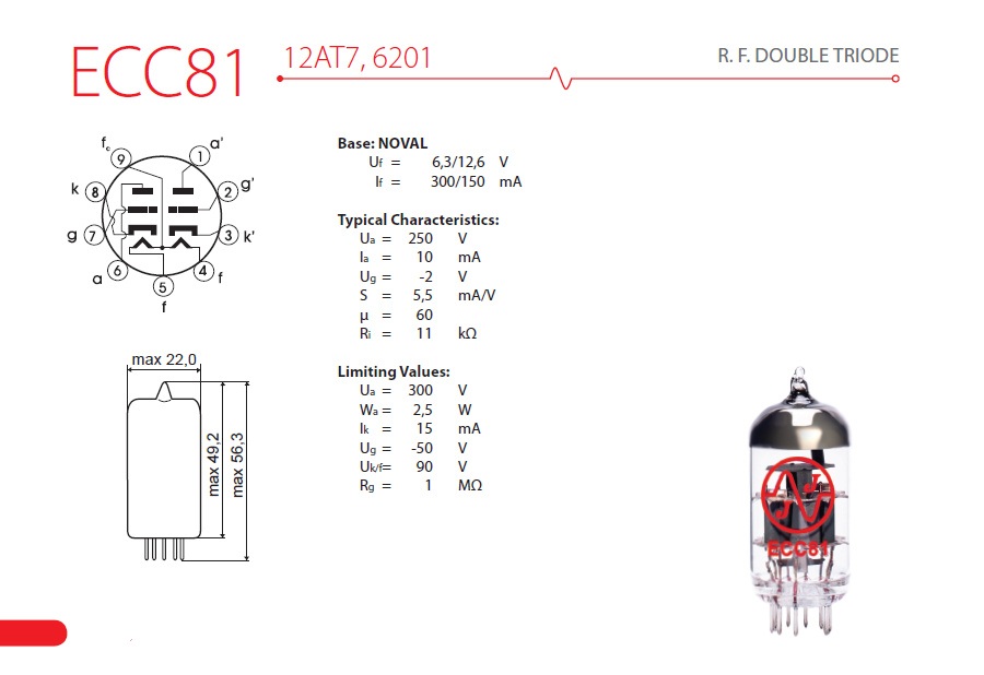 R.F. DOUBLE TRIODEECC81 is 12AT7 medium gain pre-amplifying double triode. Can be also used as replacement for 12AX7 in many applications. Very smooth and warm sound. Very low microphonic. Good for phase inverters or reverb drivers.