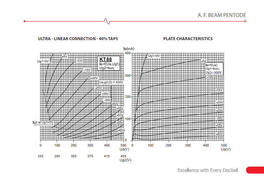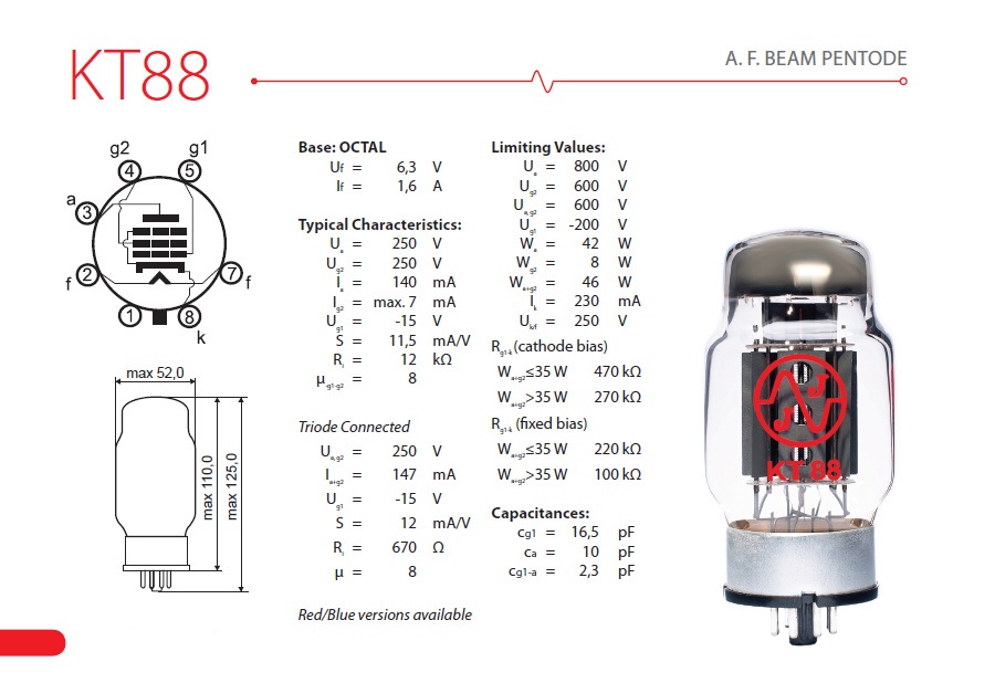 A.F. BEAM PENTODEKT88 is a beam output pentode with an octal base and power of 42W. Very powerful, with strong bass and very bright highs. It can also be used in 6550 amplifiers.